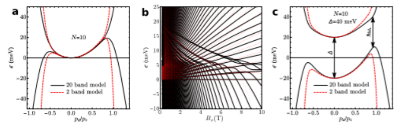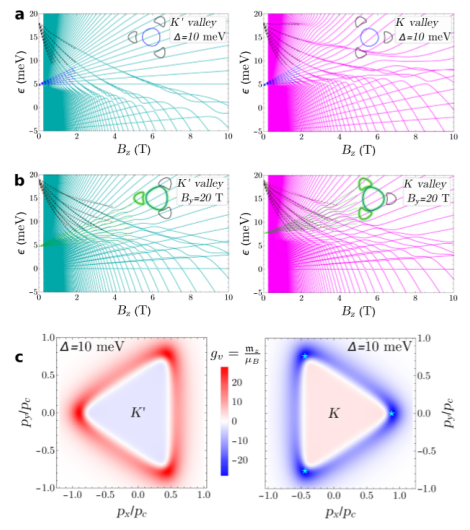 Fig. 7 a Landau能級譜是在Δ=5meV時垂直磁場Bz的函數(shù)。b 對于在K’/K處的Δ=5meV,繪制了B