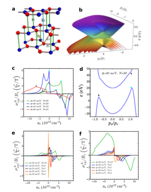 從自旋-軌道耦合驅(qū)動的拓撲絕緣體到石墨烯,許多材料中都出現(xiàn)了拓撲非平凡態(tài)。在單層和雙層石墨烯等含有多溝道導體中,盡管整個布里淵帶的總Chern數(shù)為零,但集中在不同波谷不同信號的Berry曲率會影響材料的傳輸特性。在這里,我們研究了菱形六面體石墨的薄膜,發(fā)現(xiàn)其似乎可以保留多達幾十層的真正二維特性,并具有大Berry曲率的二維電子態(tài),同時伴隨著巨大的電子固有磁矩。可以通過靜電門控來控制每個波谷附近的Berry曲率和磁化強度,從而產(chǎn)生可調(diào)節(jié)的異常霍爾效應和二維Landau能級譜的特殊結(jié)構(gòu)。
