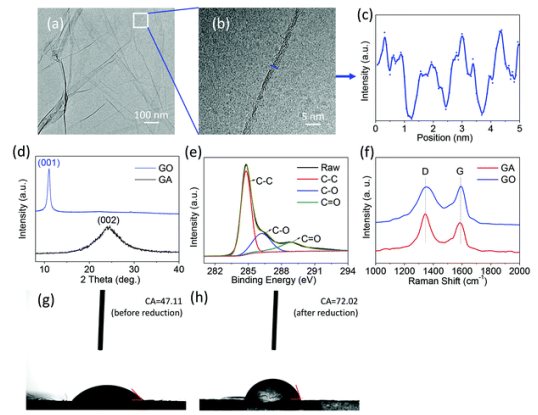 Fig. 1 GO懸浮液的(a) TEM圖和(b) HRTEM圖;(c)大塊GO的強度分布圖;(d) GO和GA的XRD圖;(e) GA的c1s XPS譜;(f) GO和GA的拉曼光譜;(g)還原前和 (h) 還原后GO與水的接觸角。