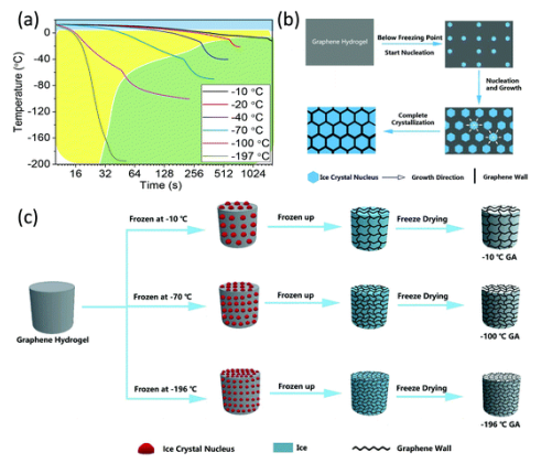 現(xiàn)階段,迫切需要對成型技術(shù)有深入的了解,以便精確地調(diào)整石墨烯氣凝膠(GA)的孔結(jié)構(gòu)來適應(yīng)各種應(yīng)用背景。在本文中,通過使用從-10℃到-196°C冷凍的冰晶模板進行冷凍鑄造,以此調(diào)節(jié)GA的微觀結(jié)構(gòu)和性能。采用相場模擬方法研究了石墨烯-水系統(tǒng)在冷凍過程中的微觀結(jié)構(gòu)演變。實驗和仿真結(jié)果均表明,過冷度是冰晶成核和生長的基礎(chǔ),并主導(dǎo)了GA的衍生形態(tài)。通過將冷凍溫度從-10°C降低到-196°C,GA的孔徑大小從240 μm調(diào)控到6 μm,但恒定密度始終保持在8.3 mg cm
