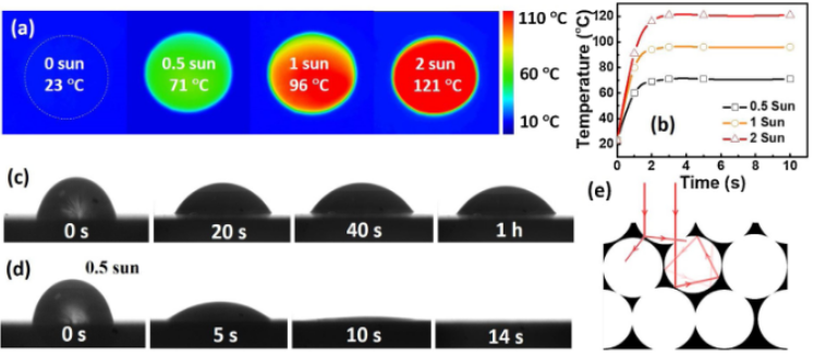 Fig. 3. 石墨烯瓦片的太陽能加熱激活原油吸收。(a)模擬不同強(qiáng)度太陽照射下石墨烯瓦的紅外圖。(b)在0.5-2太陽照射下,石墨烯瓦表面溫度迅速上升至穩(wěn)態(tài)值。室溫下(c)無和(d)有0.5日光照射在石墨烯瓦上的原油滴,(e)夾在瓦片中的光線經(jīng)過反復(fù)的內(nèi)部反射后的示意圖。