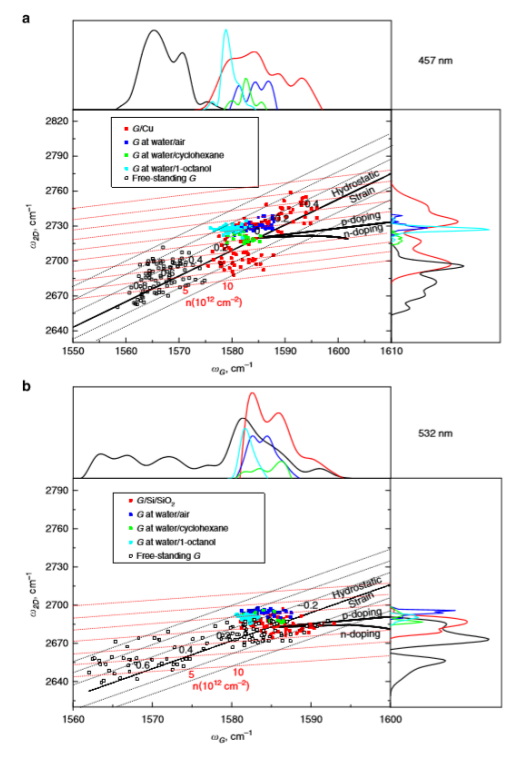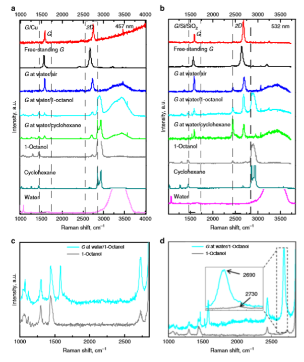 固體基材通常會(huì)在石墨烯單層中引起不均勻的應(yīng)變和摻雜,因此會(huì)改變石墨烯的內(nèi)在特性,從而降低其電荷載流子的遷移率,進(jìn)而降低其整體電性能。在此,我們利用共焦拉曼光譜直接研究了石墨烯在水面上的自由漂浮性,結(jié)果表明,液體載體緩解了預(yù)先存在的應(yīng)變,幾乎沒(méi)有摻雜效應(yīng),恢復(fù)了石墨烯片的均勻性。與固體載體相比,這種效應(yīng)源自于液體的結(jié)構(gòu)適應(yīng)性和靈活性、較低的污染和較弱的分子間鍵合,而與液體的化學(xué)性質(zhì)無(wú)關(guān)。此外,我們證明了水可以提供一個(gè)研究和區(qū)分化學(xué)缺陷和基質(zhì)誘導(dǎo)缺陷的平臺(tái),特別是在氫化石墨烯的情況下。因此,與固體載體相比,液體載體在一系列應(yīng)用中具有優(yōu)勢(shì),特別是在監(jiān)測(cè)化學(xué)修飾后的石墨烯結(jié)構(gòu)變化方面。