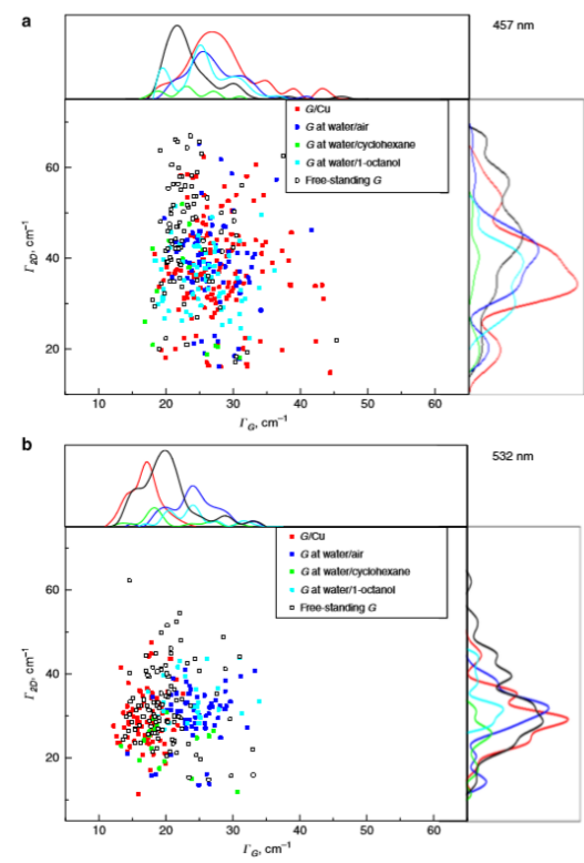Fig. 3 在不同固體和液體載體上,石墨烯G和2D拉曼半峰全寬的相關(guān)圖和統(tǒng)計(jì)分布(FWHM或?