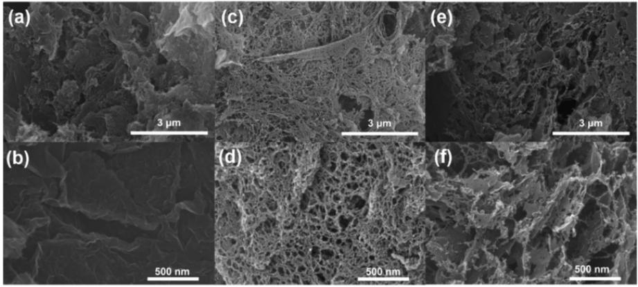 Fig 2. 不同放大倍數(shù)下的SEM圖像: (a,b) Fe