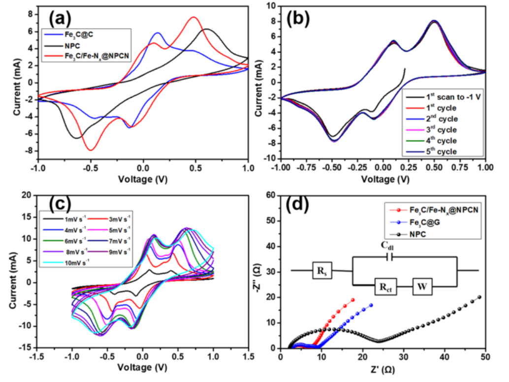 x@NPCN對稱電池在不同掃描速率下的CV曲線。 (d) Fe