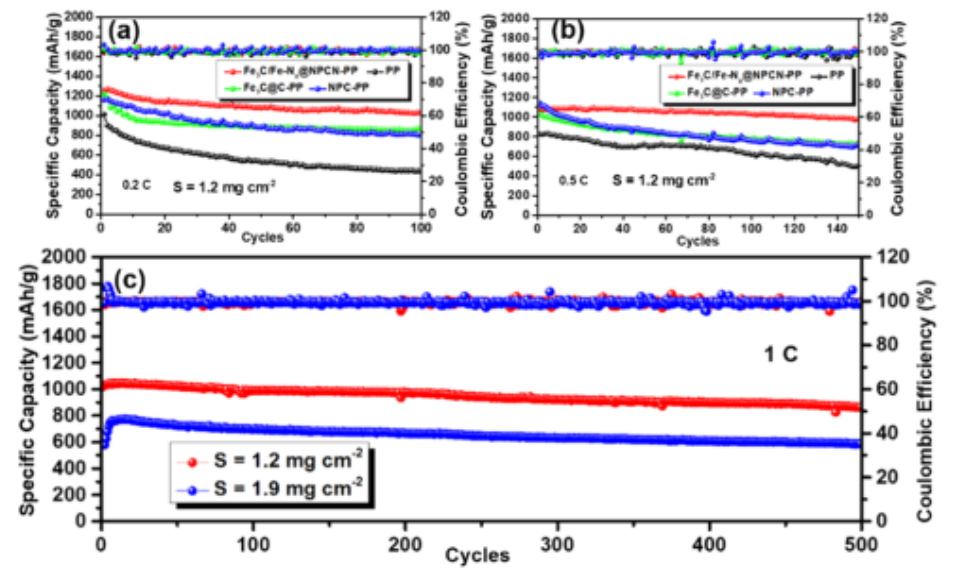 3C@C-PP,NPC-PP和PP電池在0.2 C和0.5 C的電流密度下的循環(huán)性能。 (c) 在1 C的高電流密度下,不同硫含量(1.2和1.9 mg cm