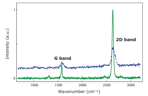Figure 1. 由cw激光器(綠線)和sub-ps脈沖激光器(藍(lán)線)激發(fā)的石墨烯的拉曼光譜