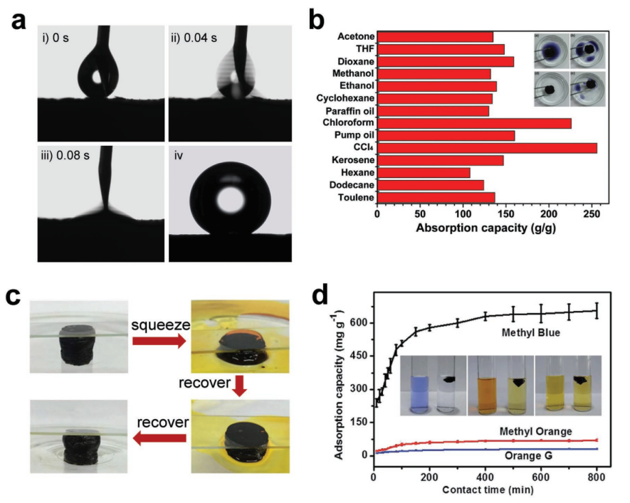 Figure 1. 3D GBM作為吸附劑,用于從水中去除有機(jī)污染物。ai–aiii)一滴十六烷的吸收過(guò)程,以及a-iv)GA表面上水滴的光學(xué)照片。b)rGO氣凝膠對(duì)不同有機(jī)溶劑的吸收能力,插圖:從水中吸收甲苯的過(guò)程(用蘇丹黑B染色)。c)吸附/解吸循環(huán)顯示細(xì)胞GA對(duì)正己烷具有極好的可回收性(蘇丹紅G染色)。d)不同染料的rGO氣凝膠的吸收能力。