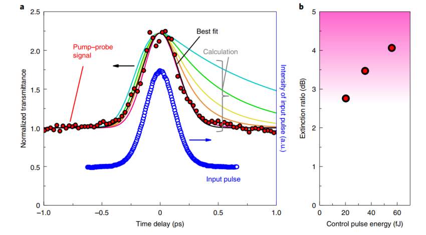 2)。由于極端的光限制,我們大大增強了石墨烯中的光學非線性吸收,并以35 fJ的開關能量和260 fs的開關時間,實現(xiàn)了超快的全光開關。開關能量比以前基于石墨烯的器件小四個數(shù)量級,并且是所有在幾皮秒或更短時間內運行的全光開關的最小值。該器件可以有效地連接到常規(guī)的硅波導,并可以用在硅光子集成電路中。我們相信,這種基于石墨烯的器件將為芯片的超快和高能效的光子處理鋪平道路。