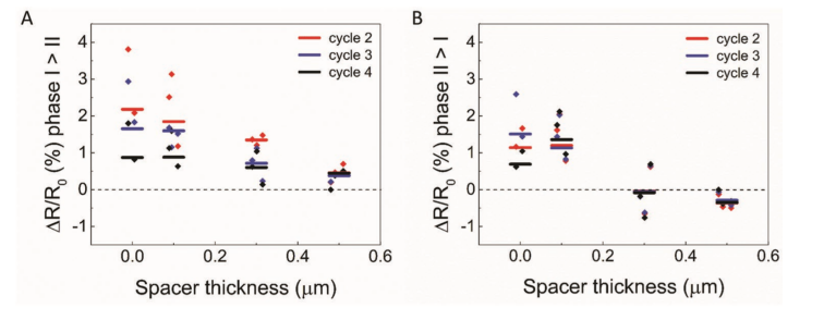 Figure 3. 遠程檢測具有不同墊片厚度的自旋交叉。A)設(shè)備對第一階段到第二階段轉(zhuǎn)變的響應(yīng)。B) II至I階段過渡的設(shè)備響應(yīng)。