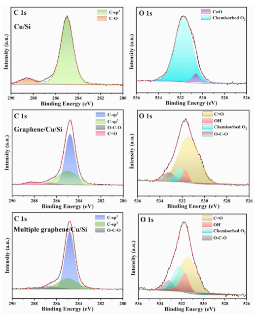 Figure 3. 頂部修飾有石墨烯或不修飾石墨烯的電沉積銅樣品的C 1s 和O 1s 的XPS譜圖。