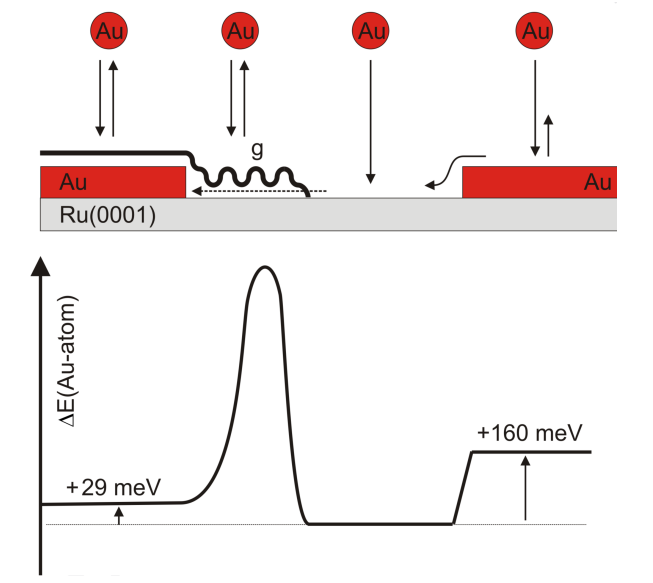 Figure 6.(頂部)Ru(0001)上Au沉積和嵌入的示意圖; (底部)與單個(gè)Au吸附原子的嵌入有關(guān)的電位分布在。勢能曲線說明在石墨烯邊緣的石墨烯-Ru相互作用更強(qiáng),從而導(dǎo)致較大的插層勢壘。為便于觀察,能壘的高度和寬度被夸大,不應(yīng)用于定量測量。