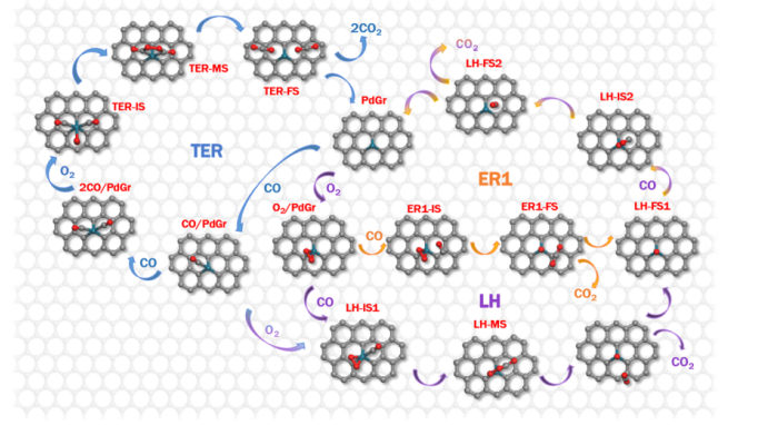Figure 3. PdGr表面進(jìn)行CO氧化過(guò)程時(shí)的反應(yīng)途徑。在ER1,TER和rLH途徑上出現(xiàn)的反應(yīng)物種分別用黑色,藍(lán)色,橙色和紫色線相連,而通過(guò)不同路徑共享的物種則通過(guò)共同的顏色線相連。每個(gè)反應(yīng)路徑產(chǎn)生的物質(zhì)用紅色字表示,而在微動(dòng)力學(xué)模擬中其縮寫(xiě)名用淺藍(lán)色標(biāo)識(shí)。
