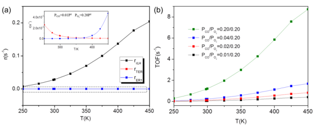 O2比例下,TOF隨溫度的變化情況。沿著TER和ER1途徑的反應(yīng)速率相似,圖(a)中的插圖是對(duì)應(yīng)的放大圖。