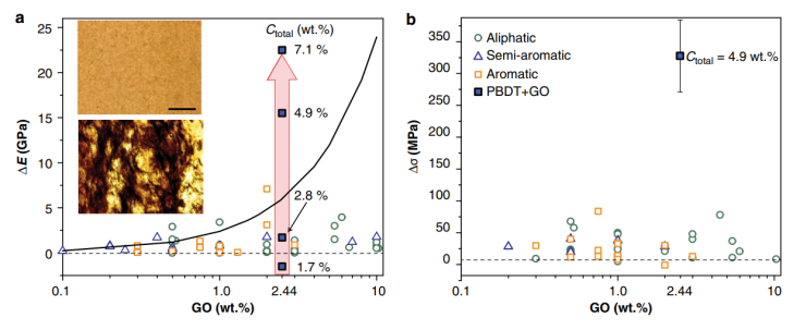 Figure 4. (a)通過(guò)動(dòng)態(tài)機(jī)械熱分析PBDT+GO納米復(fù)合材料(用實(shí)心藍(lán)色方塊表示)提高的儲(chǔ)能模量(E')。(b)通過(guò)拉伸應(yīng)力-應(yīng)力來(lái)測(cè)量增強(qiáng)強(qiáng)度。