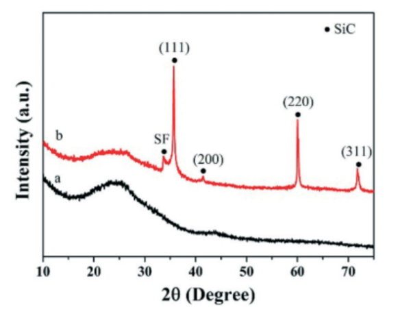 Figure 2. (a) 石墨烯原材料和 (b) 具有納米片的SiC納米線的XRD圖。