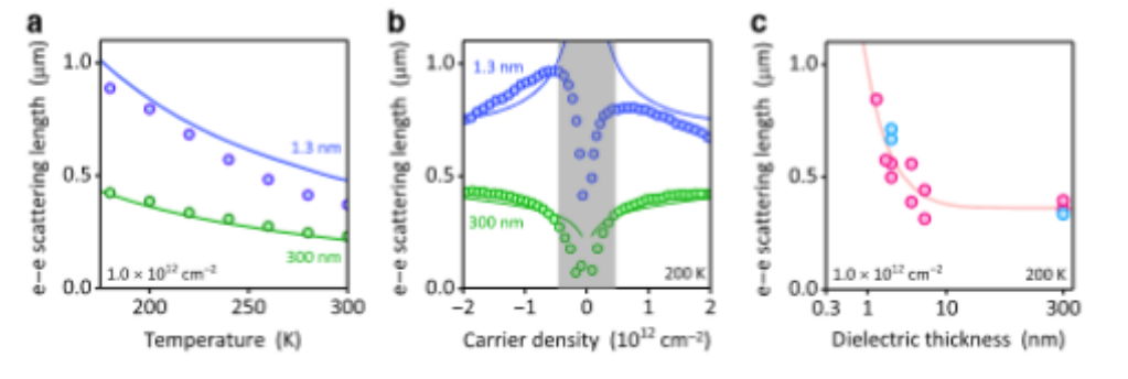 電子-電子相互作用在許多凝聚態(tài)現(xiàn)象中起著至關(guān)重要的作用,通過(guò)改變相互作用的強(qiáng)度來(lái)控制電子-電子相互作用是一種有效的方法。一種可行的方法是將研究的系統(tǒng)放置在金屬附近,這會(huì)引發(fā)額外的篩選,從而抑制電子相互作用。在這里,我們使用具有原子薄柵極電介質(zhì)和原子平金屬柵極的器件,測(cè)量了石墨烯中電子的電子散射長(zhǎng)度,并報(bào)告與標(biāo)準(zhǔn)行為的定性偏差。僅在幾納米的柵極電介質(zhì)厚度下,由屏蔽引起的變化才變得重要,該厚度比電子之間的典型間隔小得多。我們的理論分析與從單層石墨烯中電子粘度的測(cè)量和石墨烯超晶格中umklapp電子-電子散射的測(cè)量結(jié)果中得出的散射率非常吻合。該結(jié)果為將來(lái)在二維系統(tǒng)中實(shí)現(xiàn)多體現(xiàn)象的鄰近篩選提供了指導(dǎo)。