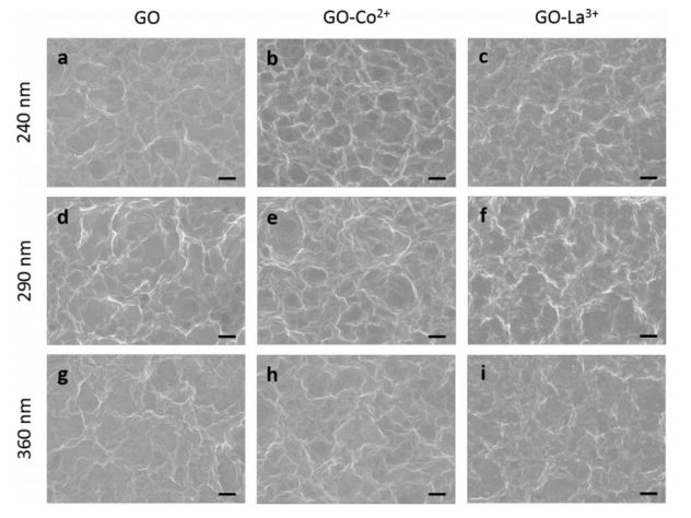 2+陽離子的交聯(lián)和嵌入來調(diào)節(jié)GO薄片的層間距離。通過場發(fā)射掃描電子顯微鏡的研究表明,GO-La