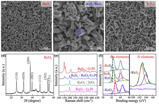 2晶體的X射線衍射圖譜;(e)幾種納米結(jié)構(gòu)材料的拉曼光譜;(f)生長的ReO