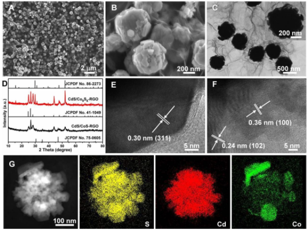 8-RGO的(A-C)FESEM和TEM圖,(D)CdS/CoS-RGO和CdS/Co