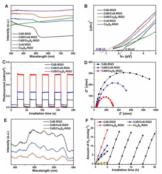 Figure 4. (A)UV/Vis光譜和(B)Kubelka-Munk曲線,(C-E)EIS曲線,PL光譜和瞬時(shí)光電流響應(yīng),(F)不同樣品在可見光照射下H2隨時(shí)間的產(chǎn)生量。