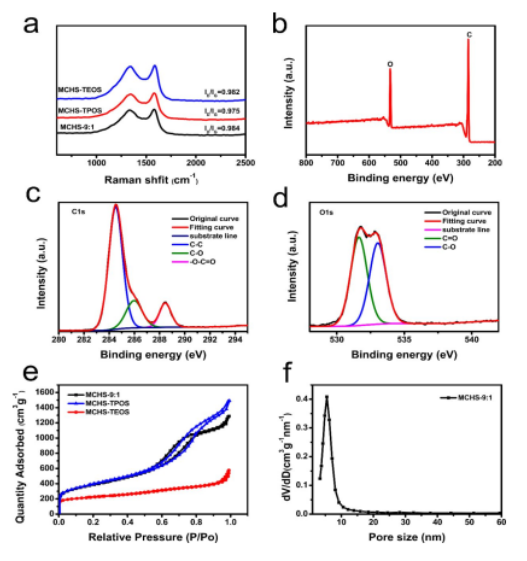 Figure 1. (a)MCHS-TEOS,MCHS-TPOS和MCHS-9:1樣品的拉曼光譜。(b)MCHS-9:1樣品的XPS總譜。(c-d)MCHS-9:1樣品的高分辨C 1s和O 1s光譜。(e)在77 K溫度下的氮氣吸附/脫附等溫線。(f)MCHS-9:1樣品的孔徑尺寸分布情況。