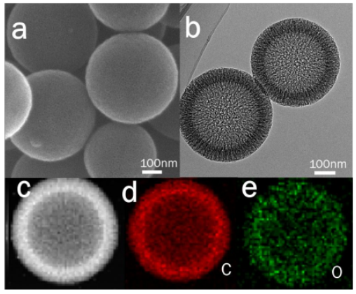 Figure 2. (a)MCHS-9:1樣品的SEM圖像。(b)MCHS-9:1樣品的TEM圖像。(c-e)MCHS-9:1樣品中C和O元素映射圖。