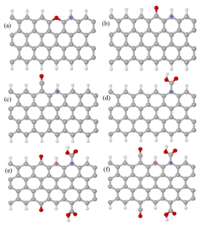 Figure 4. 在碳材料中含氧官能團構(gòu)型,(a)醚氧(e-O),(b)酮氧(k-O),(c)CO基團(c-O),(d)COOH基團,(e)混合了兩個酮氧和兩個COOH基團和(f)將兩個CO和兩個COOH基團混合在一起?;疑?,白色和紅色球分別代表碳,氫和氧原子。