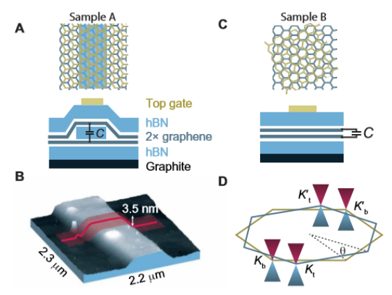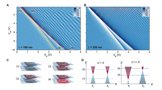 當二維晶體在原子上接近時,它們的有限厚度就變得重要了。使用傳輸測量,我們研究了兩個石墨烯層(夾角為θ= 22°)之間的靜電特性,由于這兩層的K點和K'點之間的動量不匹配,從而使這些層出現(xiàn)解耦。我們觀察到隨著層間能量差的增加,兩層零密度線出現(xiàn)分裂。這種分裂是由單層量子電容與層間電容C