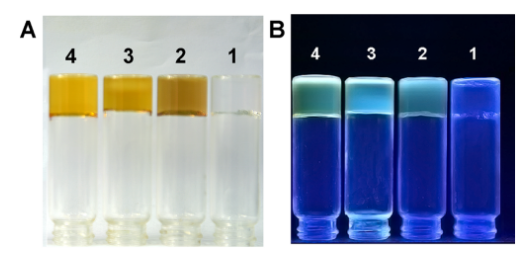 Figure 2. PAMG(1)和CD/PAMG混合物(2-4,OCD/PAMG,NCD/PAMG和ONCD/PAMG)分別在(A)太陽光下和(B)紫外光下的數(shù)碼照片。