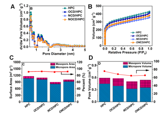 Figure 3. (A)氮吸附-解吸等溫曲線和(B)通過DFT方法計(jì)算的孔徑分布。(C,D)不同樣品里中孔/微孔的比例。