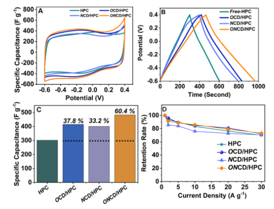 -1,循環(huán)壽命接近100%。這些結(jié)果證明,該研究所提出的方法(碳活化CDs-多孔(水)凝膠復(fù)合材料)是一個(gè)制備優(yōu)質(zhì)碳電極材料的普適方法。
