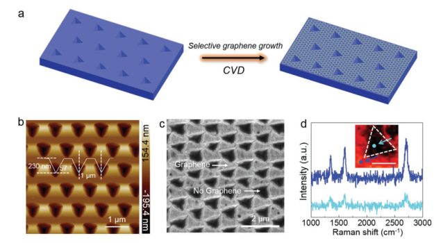Figure 1. NPSS 的c面上選擇性生長石墨烯。 a)選擇性生長的示意圖。 b)具有凹三角錐的NPSS表面的原子力顯微鏡高度圖。 c)SEM圖。 d)典型拉曼光譜。