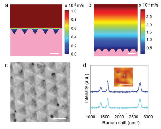 Figure 3. 通過調(diào)節(jié)碳前驅(qū)物和系統(tǒng)壓力,在NPSS上可控生長石墨烯。a-b)常壓、低壓體系下NPSS表面氣體流速的二維模擬分布。c)滿層石墨烯的SEM圖。d)滿層石墨烯覆蓋的NPSS的典型拉曼光譜。