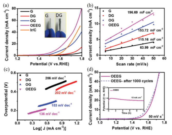 Figure 2. a)G,DG,OG,OEEG和Ir / C的極化曲線。b)1.17 V時(shí)的充電電流密度差與掃描速率的函數(shù)關(guān)系。c)Tafel斜率比較。d)OEEG在循環(huán)1000 圈CV前后的極化曲線,插圖呈現(xiàn)了在10 mA cm-2下的計(jì)時(shí)電位曲線(無iR校正)。