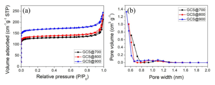 Figure 3. (a)GCS@700,GCS@800和GCS@900復(fù)合材料的氮吸附-解吸等溫線,以及(b)相應(yīng)的孔徑分布曲線。