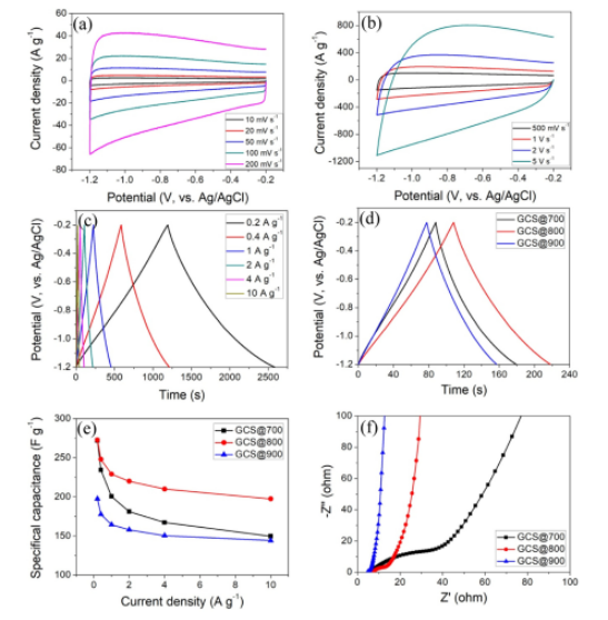 Figure 4. GCS復(fù)合材料的電化學(xué)行為:GCS@800復(fù)合材料在6 M KOH電解質(zhì)中于不同掃描速率下的CV曲線:(a)10-200 mV s-1; (b)500 mV s-1至5 V s-1,(c)GCS@800復(fù)合材料在各種電流密度下的GCD曲線,(d)三種復(fù)合材料在固定電流密度下的GCD曲線,(e)三種復(fù)合材料的比容量與電流密度的關(guān)系,(f)三種復(fù)合材料的電化學(xué)阻抗譜。
