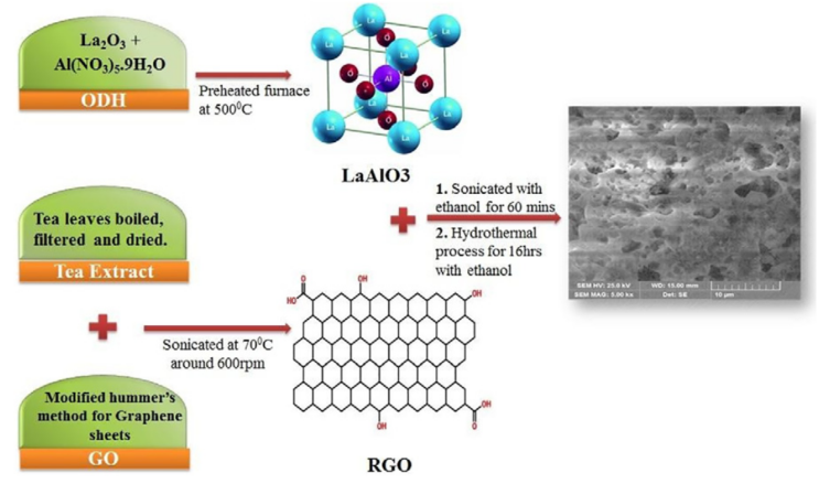 3)和還原氧化石墨烯復(fù)合物(RGO)。此處,綠茶提取物用作還原劑,用于將氧化石墨烯轉(zhuǎn)化為還原氧化石墨烯。使用XRD、SEM、EDAX、FTIR和BET技術(shù)對合成材料的形貌進行了表征。該材料用作超級電容器應(yīng)用的電極材料。電子顯微圖像表明,RGO薄片緊密地附著在LaAlO