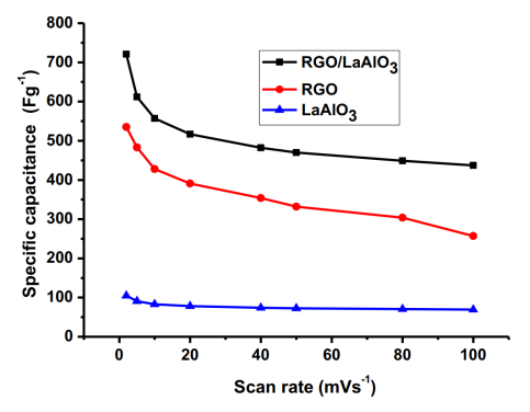 3混合結(jié)構(gòu)電極在2 mV/s的掃描速率下具有721 F/g的高比電容。通過計時電位計(CP),RGO/LaAlO