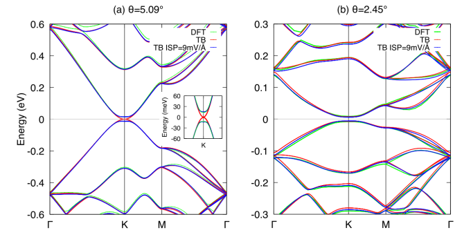 Figure 2. 使用DFT計(jì)算的(a)θ=5.09°和(b)θ=2.45° TDBG模型的能帶結(jié)構(gòu),考慮到緊密結(jié)合模型(TB)和固有極化效應(yīng)的緊密結(jié)合模型(TB+ISP)
