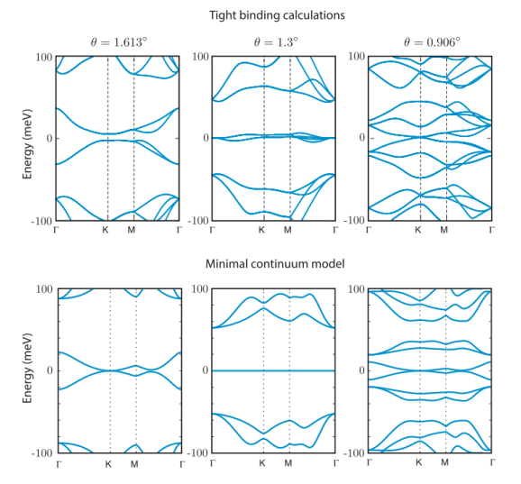 Figure 4. 從具有晶格弛豫和ISP效應(yīng)的緊密結(jié)合模型(上排)和最小連續(xù)模型(下排)獲得的魔角θ