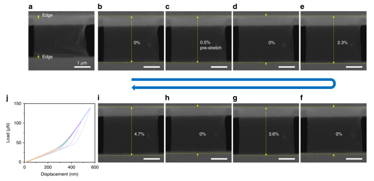 Figure 2. 懸浮單層石墨烯完全可恢復(fù)的彈性應(yīng)變。