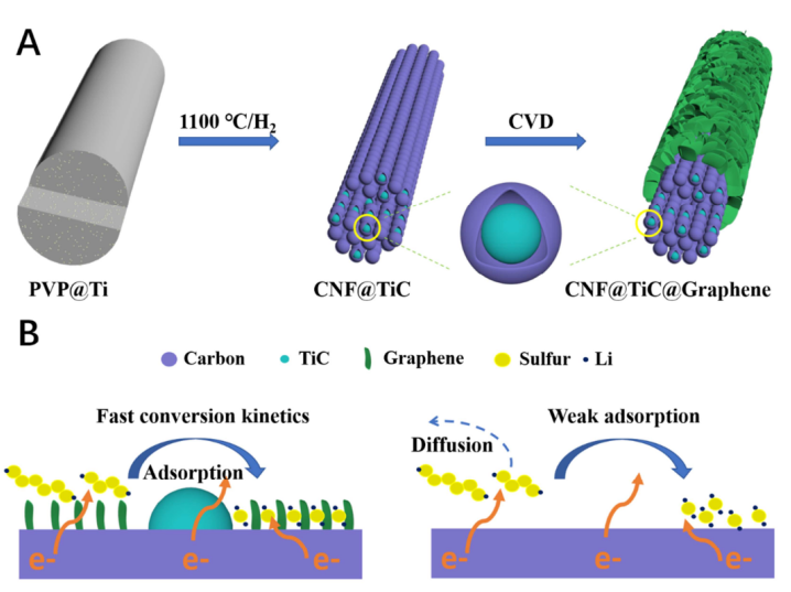 相關研究成果于2020年由鄭州大學Peng Zhang和Guosheng Shao課題組,發(fā)表在Energy Storage Materials(doi.org/10.1016/j.ensm.2020.01.029)上。原文:Vertically aligned graphene nanosheets on multi-yolk/shell structured TiC@C nanofibers for stable Li-S batteries。