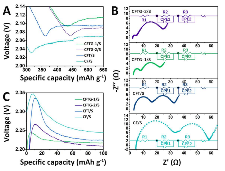 Figure 5. 在CF(A)和CFTG-1(B)基材上進行LiPS氧化還原反應和Li