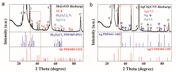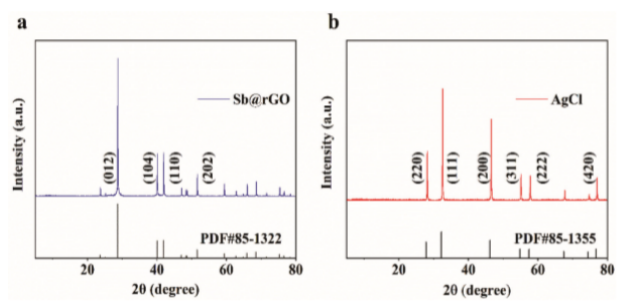 Fig. 1 (a)制備的Sb@rGO電極材料和(b) AgCl電極材料的XRD圖。