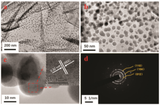Fig. 2 Sb@rGO的(a)低分辨率和(b)高分辨率的TEM圖;復(fù)合材料的(c) HRTEM圖,(d) SAED圖。