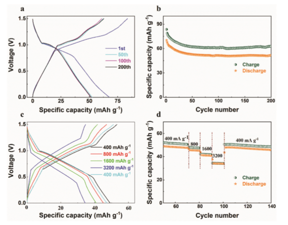−1的電流密度下,即使經(jīng)過200次循環(huán),其比容量仍保持在51.6 mA h g