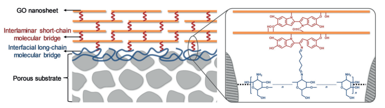 Figure 1. 通過(guò)分層的層間短鏈和界面長(zhǎng)鏈分子橋穩(wěn)定GO膜。