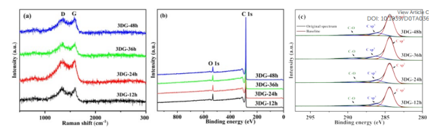 Figure 3. 3DG的結(jié)構(gòu)表征:(a)拉曼光譜,(b)XPS寬光譜曲線和(c)高分辨率C 1s XPS光譜。