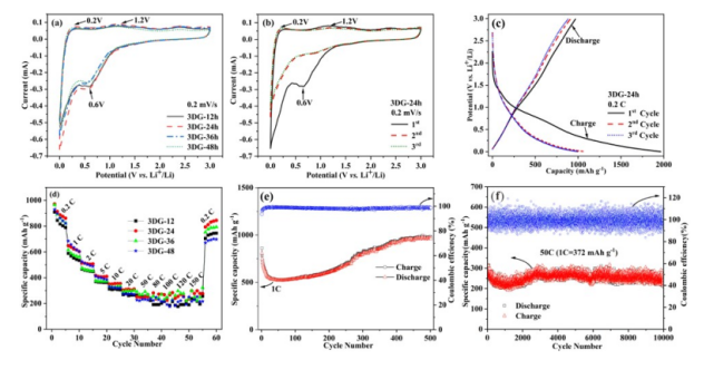 Figure 4. 電化學(xué)表征:(a)第一圈CV曲線,(b)3DG-24h電極的起始三圈CV曲線,(c)3DG-24h在0.2 C電流密度下的充電/放電曲線,(d)3DG陽(yáng)極在不同電流密度下的倍率特性,(e)循環(huán)性能和庫(kù)倫效率以及(f)3DG-24h在50 C下的長(zhǎng)期循環(huán)性